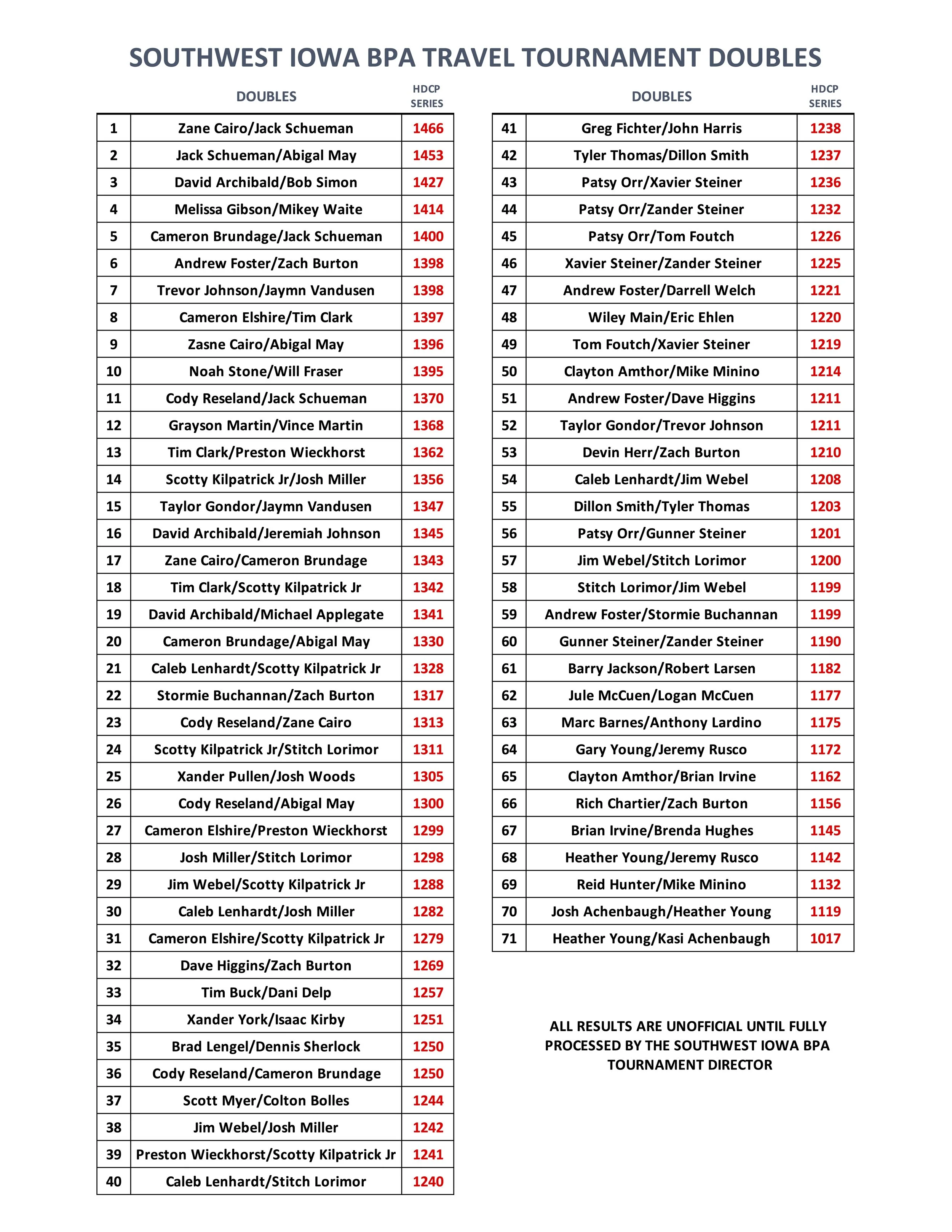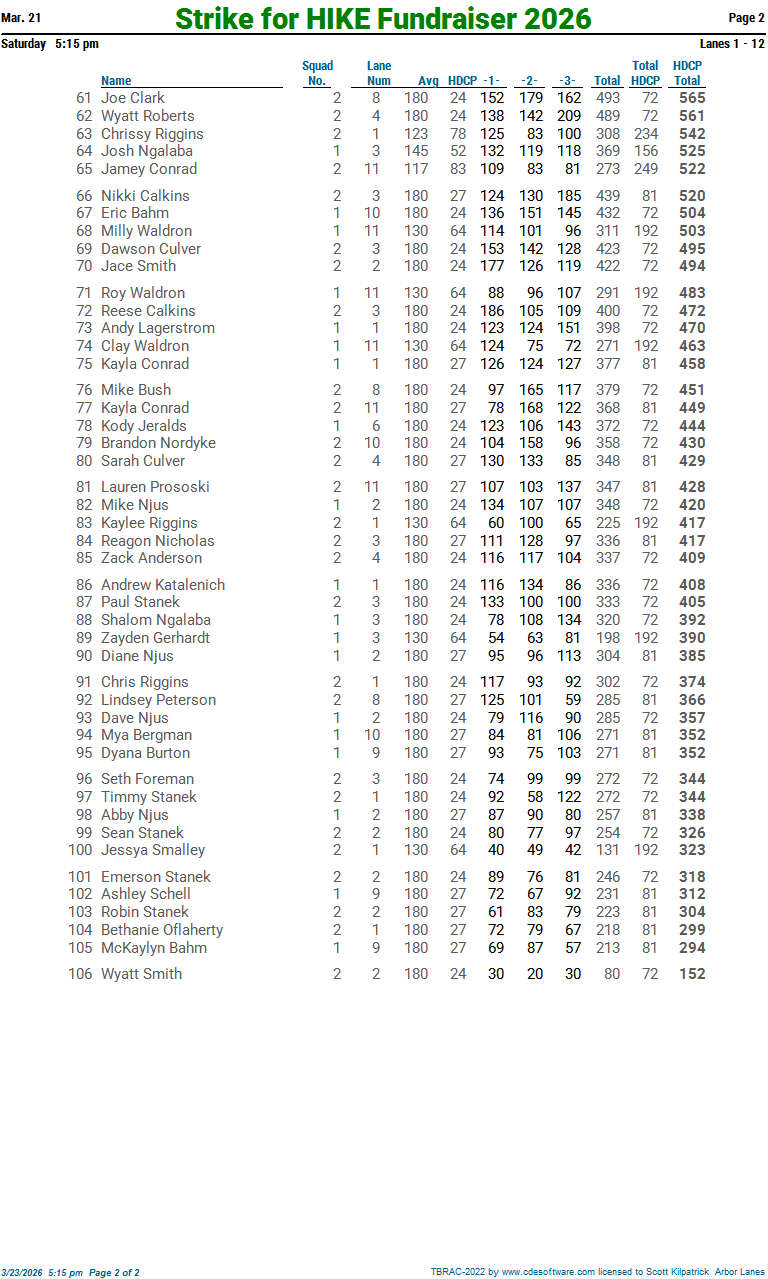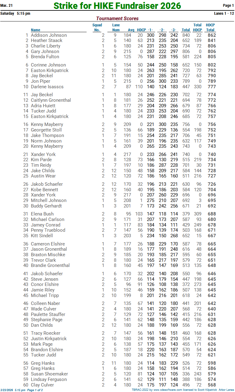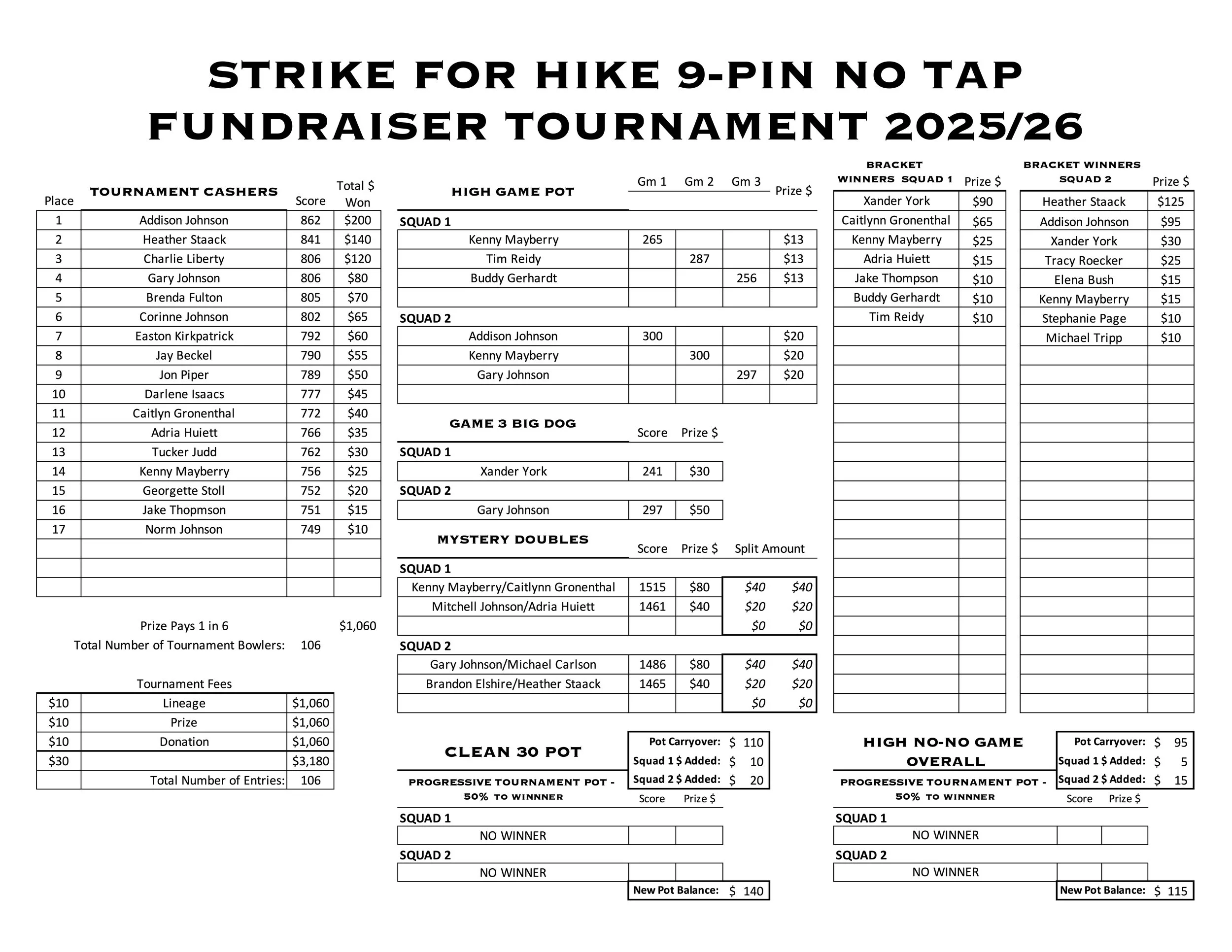STANDINGS FROM THESTRIKE FOR HIKE FUNDRAISER View fullsize View fullsize View fullsize STANDINGS FROM THESOUTHWEST IOWA BOWLING PROPRIETORS ASSOCIATION TRAVELING TOURNAMENT View fullsize STANDINGS FROM THEBALLS & DOLLS MIXED DOUBLES TOURNAMENT View fullsize View fullsize View fullsize View fullsize View fullsize View fullsize STANDINGS FROM THE PERU STATE BOWLING 9-PIN FUNDRAISER TOURNAMENT View fullsize View fullsize View fullsize View fullsize View fullsize